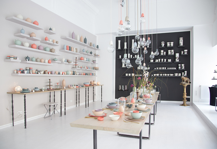 In addition to the Alice collection you can also find many other wonderful tableware, home accessories and jewelry in her brand new showroom in Vienna’s 4th district. The showroom is a treat for the eyes – white, black and grey walls, a white wooden floor, a stucco ceiling, a cosy corner with a vintage touch, stunning chandeliers, a group of pendant lights above a perfectly laid table and so many beautiful details more… Moreover, you can take a sneak peek at the atelier and the soon to be released collection „animals of the forest“. A visit and a purchase are definitely worth it!