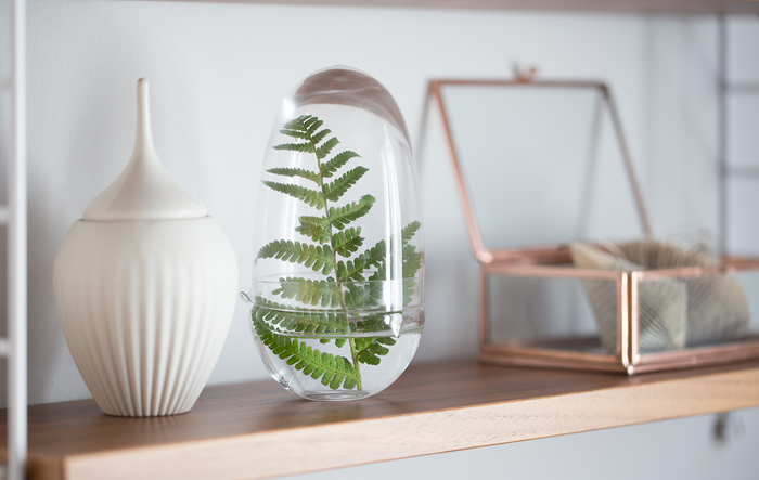 The heatwave is over – time for some fresh green on my shelf! shelf | String watch | Kählergreen vase | Muutoglass/wood box | Iittala sugar bowl | feinedinge* mini greenhouse | Design House Stockholm copper glass box | H&M Home paper ornaments | Dorisse